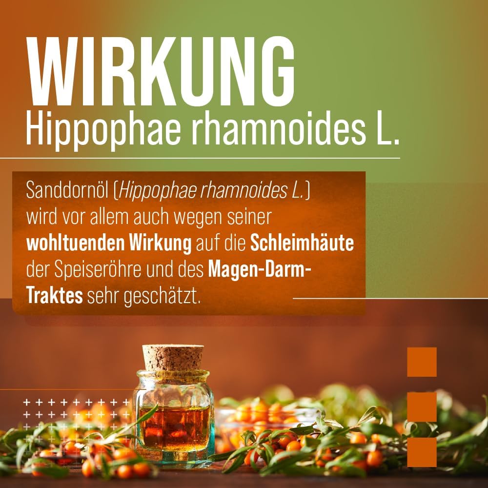 Die Sanddornöl-Kapseln von Kräuterhaus Sanct Bernhard enthalten reines Bio-Sanddornöl aus den Beeren von Hippophae rhamnoides L. Das tiefrote Öl zeichnet sich durch seinen natürlichen Gehalt an Omega-7-Fettsäuren, insbesondere Palmitoleinsäure, aus.