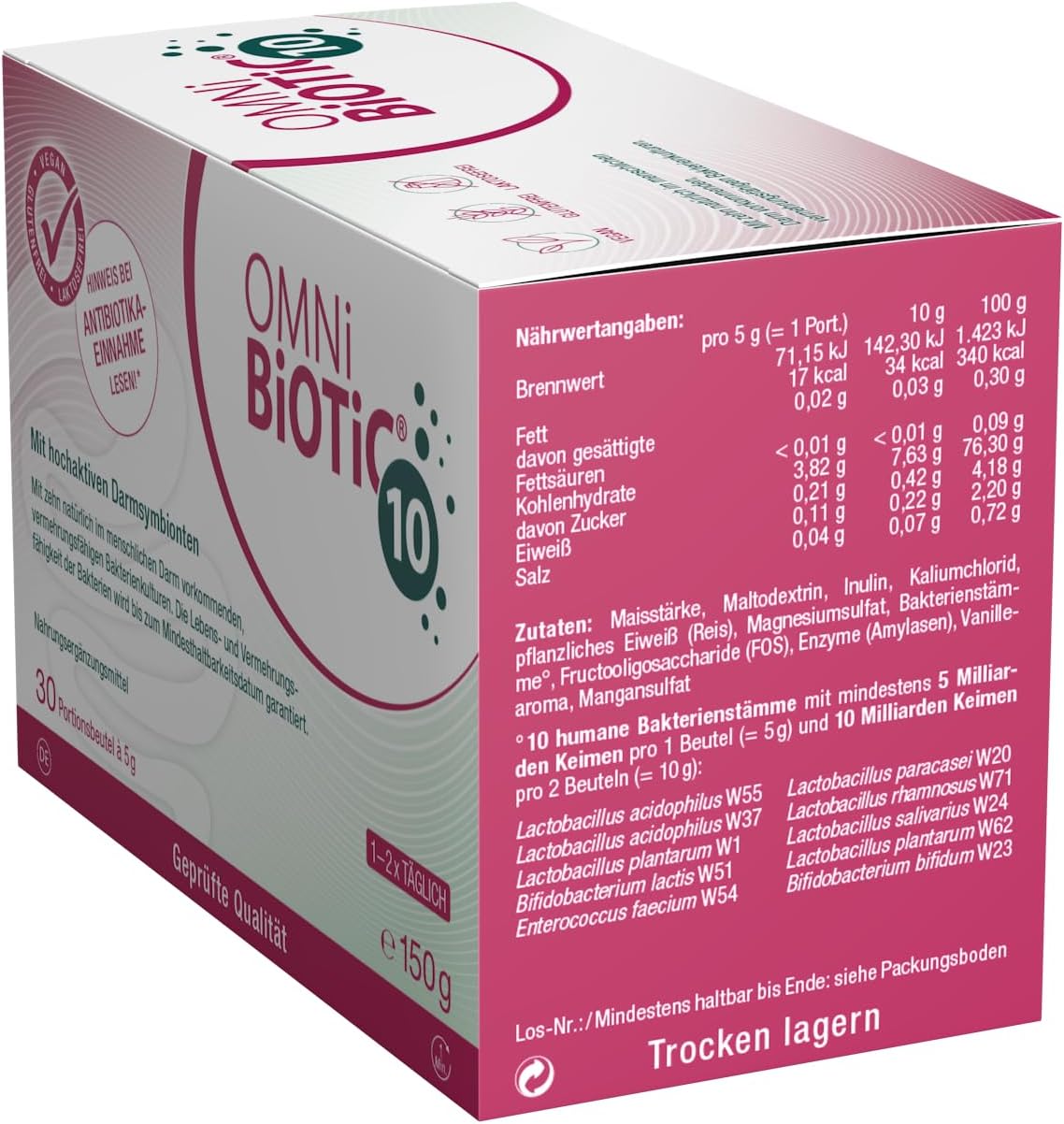 OMNi BiOTiC 10 wurde speziell dafür entwickelt, die Darmflora während und nach einer Antibiotikatherapie zu unterstützen. Die Kombination aus 10 wissenschaftlich geprüften Bakterienstämmen liefert 5 Milliarden Keime pro Portion und hilft, das bakterielle Gleichgewicht im Darm wiederherzustellen.
